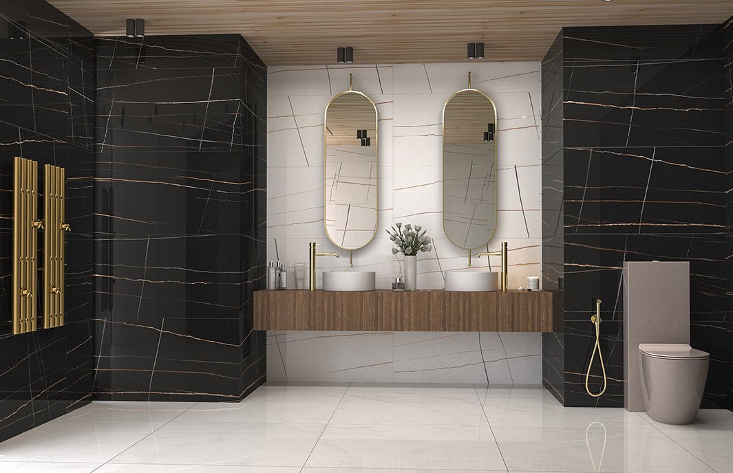 طرح کیارا مشکی و سفید فول پولیش الهام گرفته از سنگ های طبیعی سنگ مرمر ساهارا نویر سنگ مرمر ساهارا نویر یک سنگ طبیعی زیبا چشمگیر و لوکس است که به خاطر زمینه مشکی پررنگ و رگههای زیبا سفید، طلایی و مسی شناخته میشود. این سنگ مرمر که در تونس استخراج میشود، ظرافت جسورانه و زیبایی و مدرنیته را به هر فضای داخلی میآورد. طرح کیارا مشکی و سفید فول پولیش کاربردهای ایدهآل برای حمامهای لوکس، راهروهای ورودی، دیوارهای برجسته و آشپزخانههای معاصر. این طرح به زیبایی با تزیینات و لوازم طلایی از قبیل شیرآلات لوستر های زیبا ، چوب و تزئینات مینیمالیستی و مدرن سیاه یا سفید ترکیب میشود